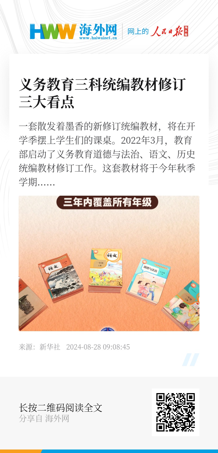 教育部近期已开展骨干教研员国家级示范培训,各地将于8月底前完成授课教师全员培训。同时,将持续开展教材使用监测,及时了解教材使用情况,充分听取社会意见,不断提高教材质量。(记者徐壮、杨湛菲、胡梦雪)