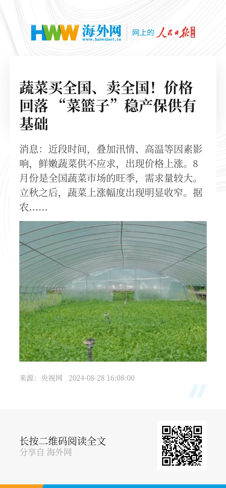 据农业农村部监测,2024年8月19—25日,重点监测的28种蔬菜周平均批发价格每公斤6.10元,环比涨2.3%,涨幅比前一周收窄5.5个百分点。
