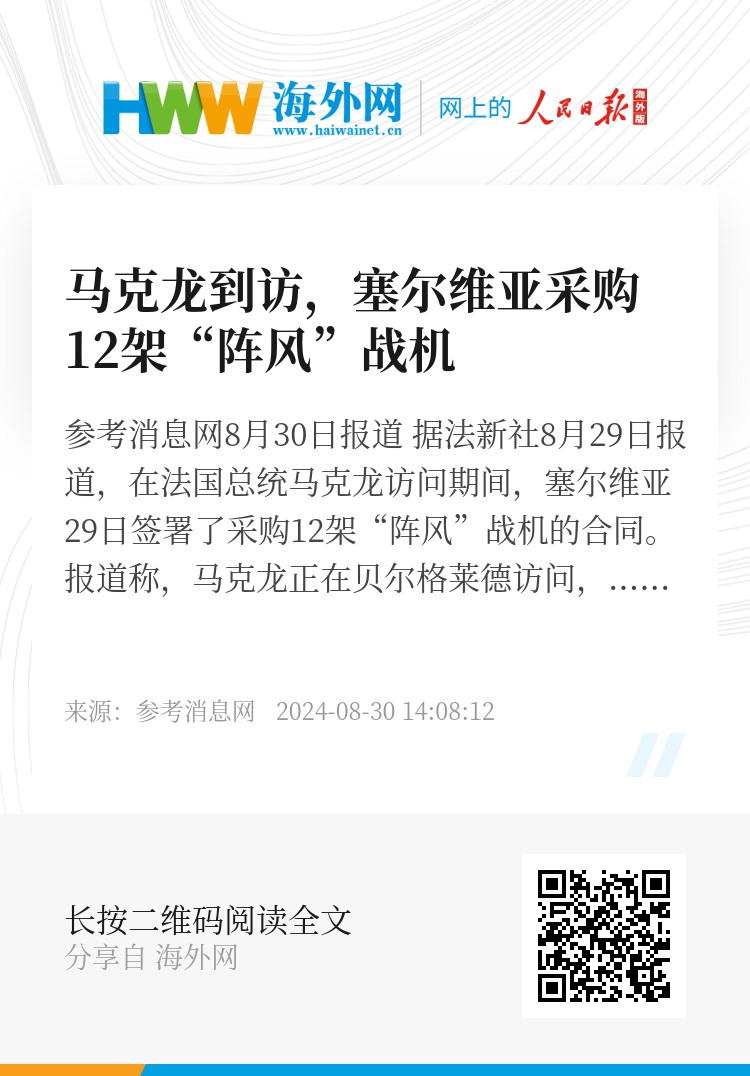 参考消息网8月30日报道 据法新社8月29日报道,在法国总统马克龙访问期间,塞尔维亚29日签署了采购12架“阵风”战机的合同。