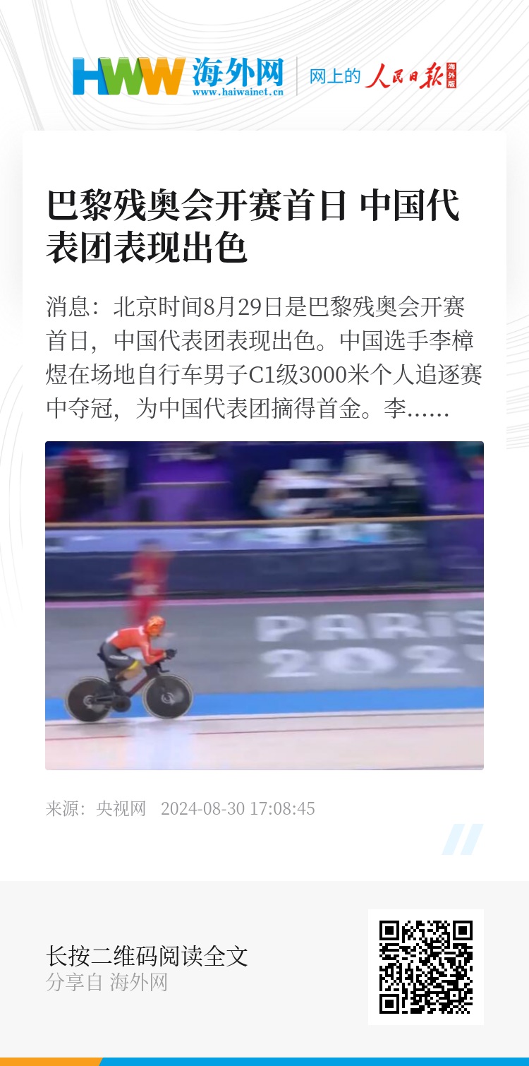 央视网消息:北京时间8月29日是巴黎残奥会开赛首日,中国代表团表现出色。中国选手李樟煜在场地自行车男子C1级3000米个人追逐赛中夺冠,为中国代表团摘得首金。