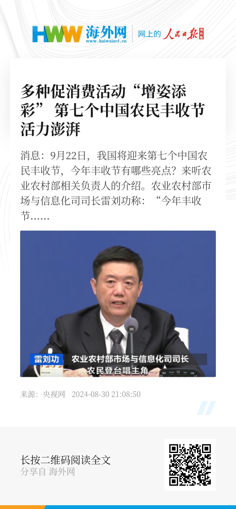 央视网消息:9月22日,我国将迎来第七个中国农民丰收节,今年丰收节有哪些亮点?来听农业农村部相关负责人的介绍。