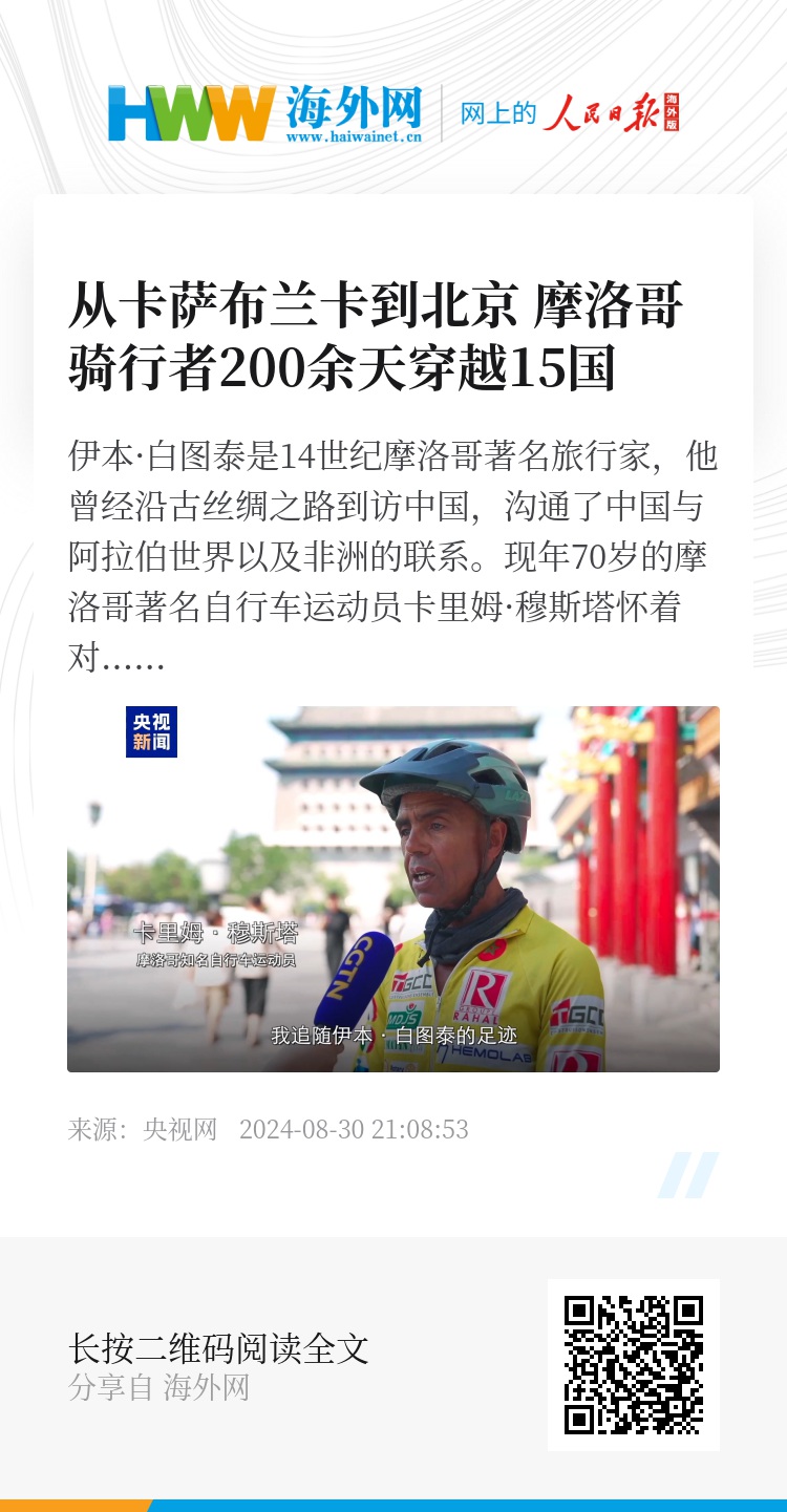 摩洛哥知名自行车运动员 卡里姆·穆斯塔:我追随伊本·白图泰的足迹,从卡萨布兰卡一路来到北京。伊本·白图泰是摩洛哥人,他比我早9个世纪完成了这一壮举。