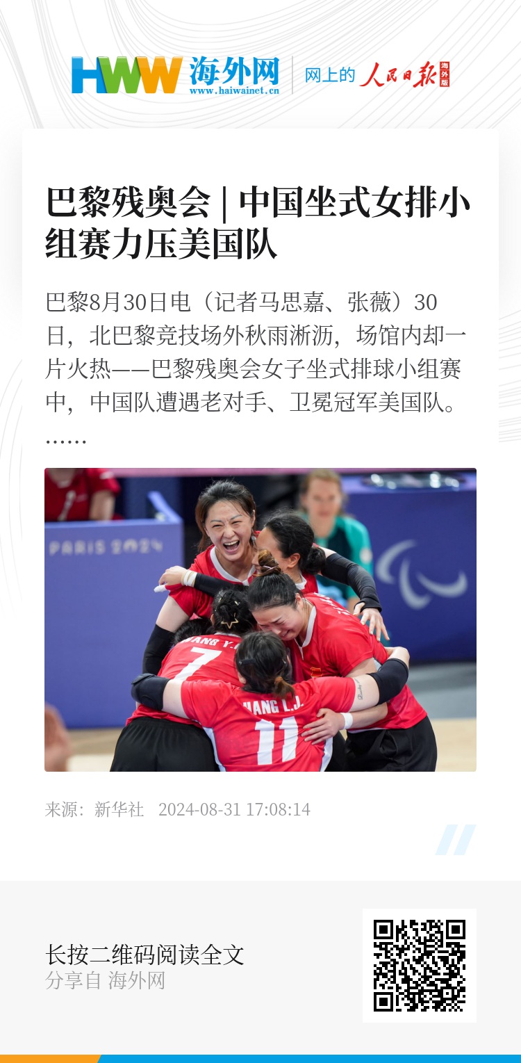 新华社巴黎8月30日电(记者马思嘉、张薇)30日,北巴黎竞技场外秋雨淅沥,场馆内却一片火热——巴黎残奥会女子坐式排球小组赛中,中国队遭遇老对手、卫冕冠军美国队。