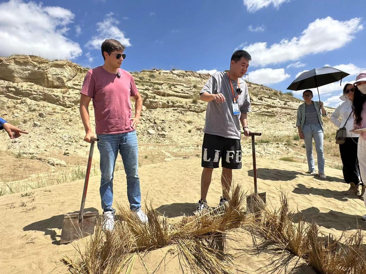 网红博主麦克斯(左)和阿升体验扎草方格 摄影 刘雨菁
