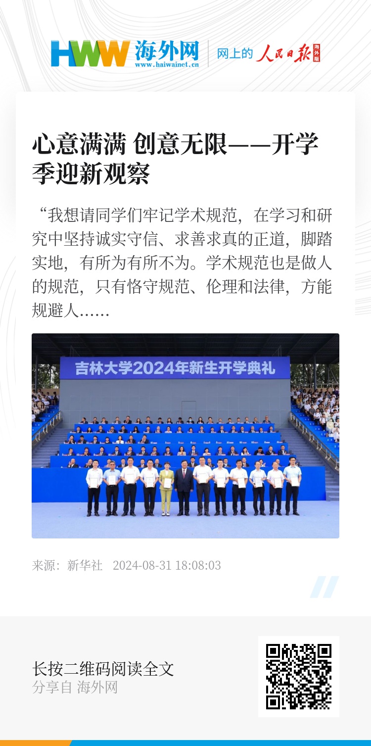 近日,各地学校迎来开学季。在吉林大学开学典礼上,校长张希与2024届新生分享了为学、为事、为人的经验和感悟,帮助新同学锚定前行方向。同时,学校还邀请优秀学生、教师和校友代表讲述励志故事,寄语新生。