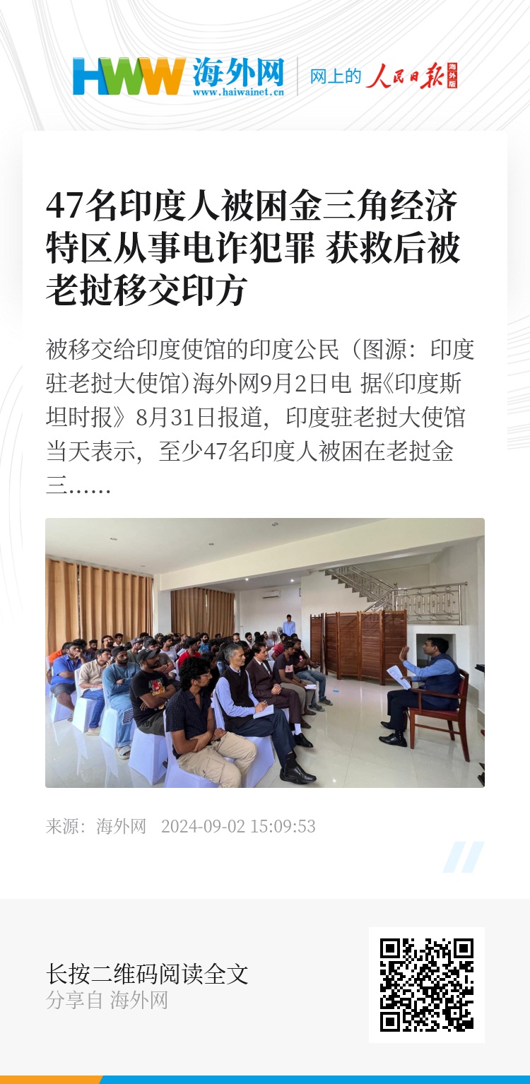 海外网9月2日电 据《印度斯坦时报》8月31日报道,印度驻老挝大使馆当天表示,至少47名印度人被困在老挝金三角经济特区从事电诈犯罪,他们获救后已被移交给印度方面。印度政府建议该国公民警惕虚假工作机会,以免成为骗局受害者。