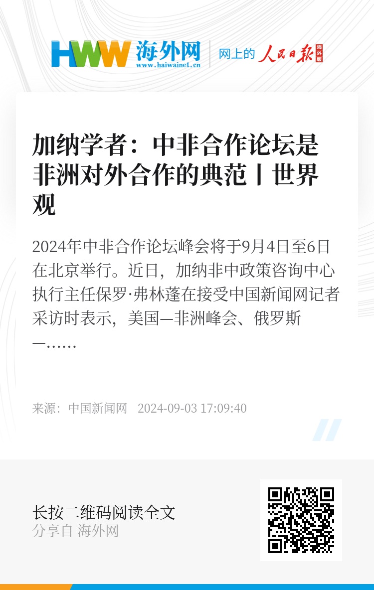2024年中非合作论坛峰会将于9月4日至6日在北京举行。近日,加纳非中政策咨询中心执行主任保罗·弗林蓬在接受中国新闻网记者采访时表示,美国—非洲峰会、俄罗斯—非洲峰会、英国—非洲投资峰会……这些峰会都受到中非合作论坛的启发和影响,中非合作论坛的独特模式赢得了广泛的国际赞誉,拥有深远的世界影响力。
