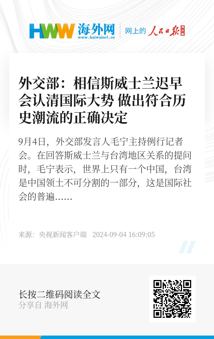 9月4日,外交部发言人毛宁主持例行记者会。在回答斯威士兰与台湾地区关系的提问时,毛宁表示,世界上只有一个中国,台湾是中国领土不可分割的一部分,这是国际社会的普遍共识。非洲国家普遍坚持一个中国原则,认为中非合作有助于非洲经济振兴,实现可持续发展。斯威士兰同台湾地区发展官方关系,不符合斯方的自身利益。我们相信斯威士兰迟早会认清国际大势,做出符合历史潮流的正确决定。(总台央视记者 张雪松 )