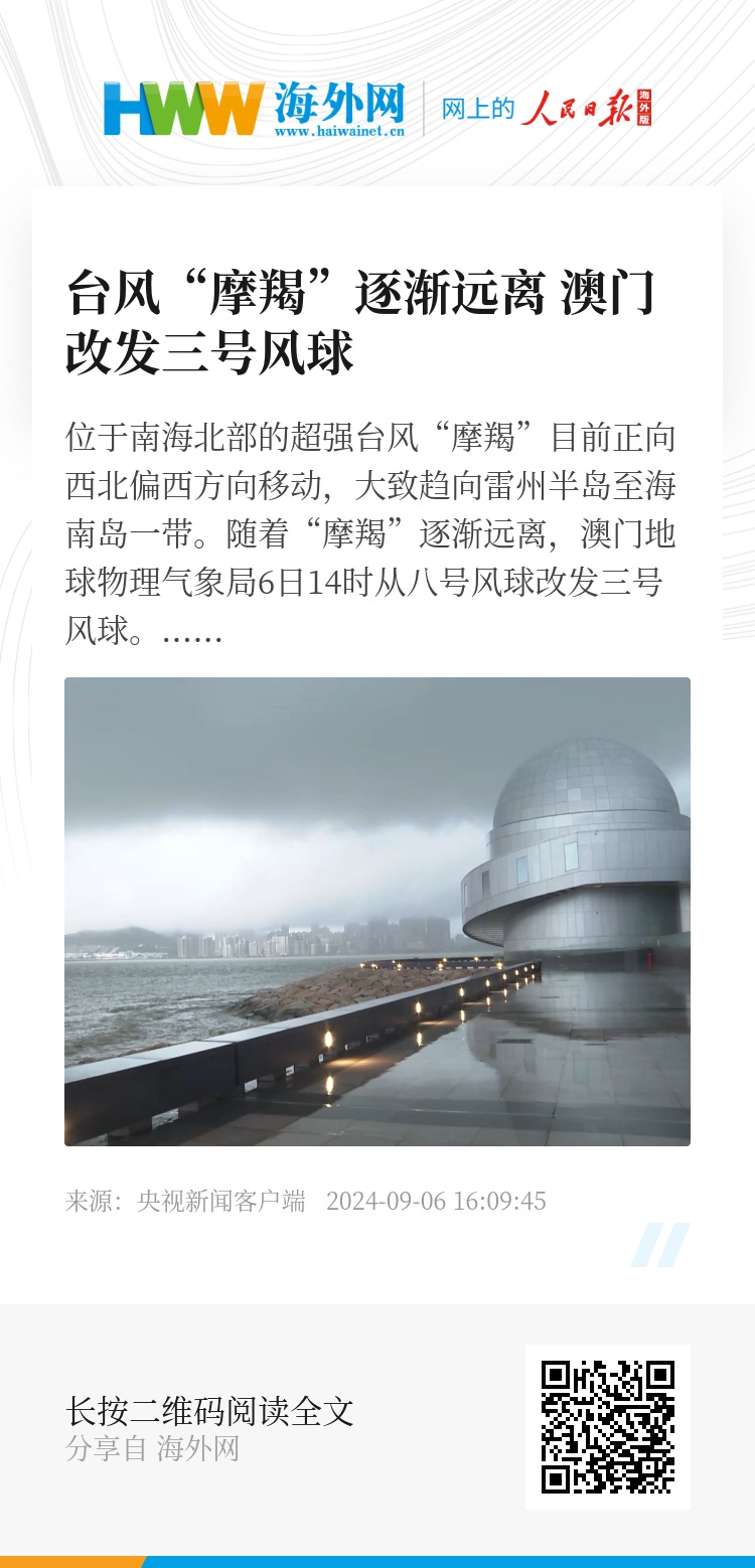 位于南海北部的超强台风“摩羯”目前正向西北偏西方向移动,大致趋向雷州半岛至海南岛一带。随着“摩羯”逐渐远离,澳门地球物理气象局6日14时从八号风球改发三号风球。