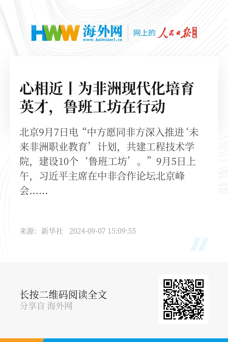 新华社北京9月7日电 “中方愿同非方深入推进‘未来非洲职业教育’计划,共建工程技术学院,建设10个‘鲁班工坊’。”9月5日上午,习近平主席在中非合作论坛北京峰会开幕式上发表主旨讲话时说。