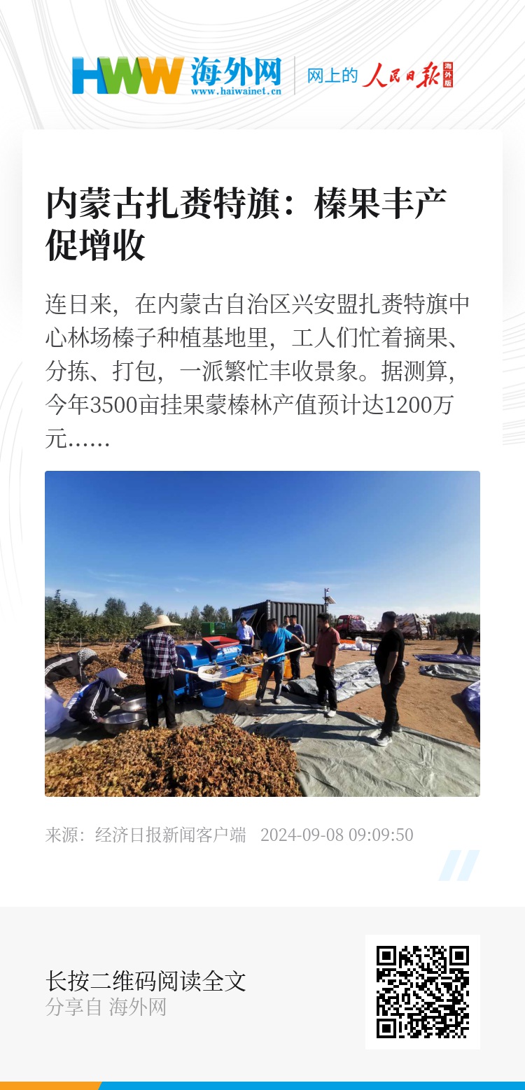连日来,在内蒙古自治区兴安盟扎赉特旗中心林场榛子种植基地里,工人们忙着摘果、分拣、打包,一派繁忙丰收景象。据测算,今年3500亩挂果蒙榛林产值预计达1200万元。