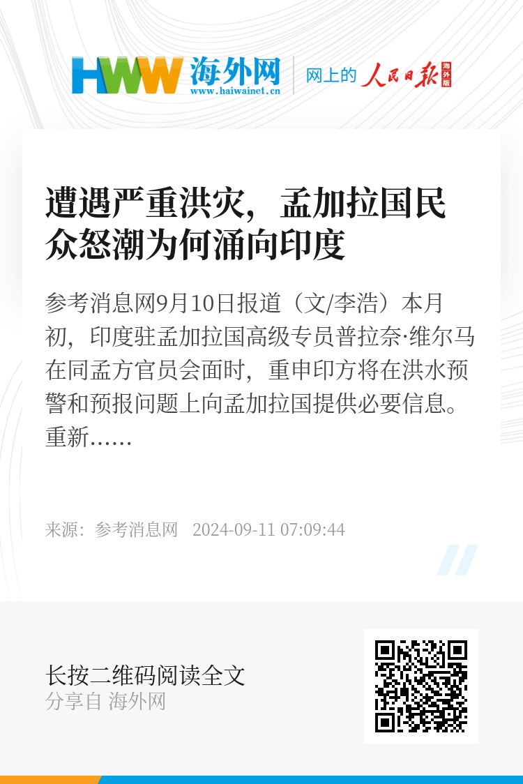 参考消息网9月10日报道(文/李浩)本月初,印度驻孟加拉国高级专员普拉奈·维尔马在同孟方官员会面时,重申印方将在洪水预警和预报问题上向孟加拉国提供必要信息。重新强调这一领域合作的背景是:就在8月下旬,孟加拉国民众曾怒斥印度在“未事先通知”的情况下突然开闸泄洪,导致孟加拉国遭受严重洪灾。
