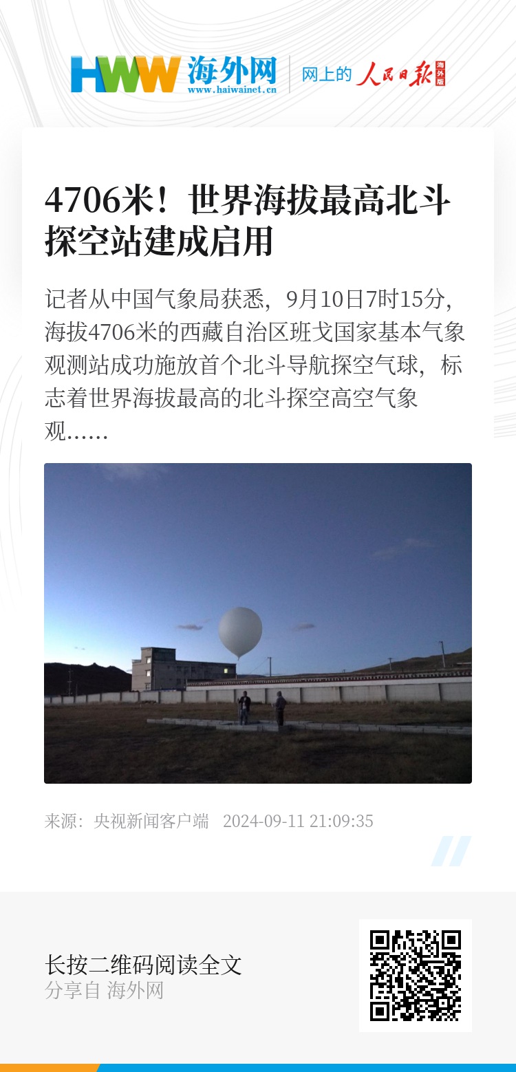 记者从中国气象局获悉,9月10日7时15分,海拔4706米的西藏自治区班戈国家基本气象观测站成功施放首个北斗导航探空气球,标志着世界海拔最高的北斗探空高空气象观测站(以下简称“北斗探空站”)建成。