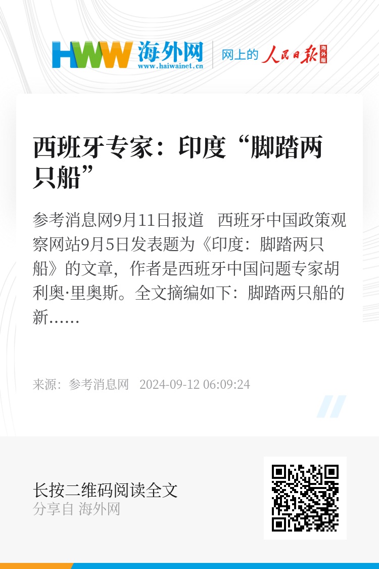 参考消息网9月11日报道 西班牙中国政策观察网站9月5日发表题为《印度:脚踏两只船》的文章,作者是西班牙中国问题专家胡利奥·里奥斯。全文摘编如下: