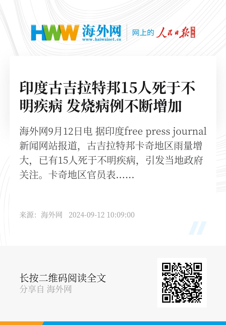 海外网9月12日电 据印度free press journal新闻网站报道,古吉拉特邦卡奇地区雨量增大,已有15人死于不明疾病,引发当地政府关注。