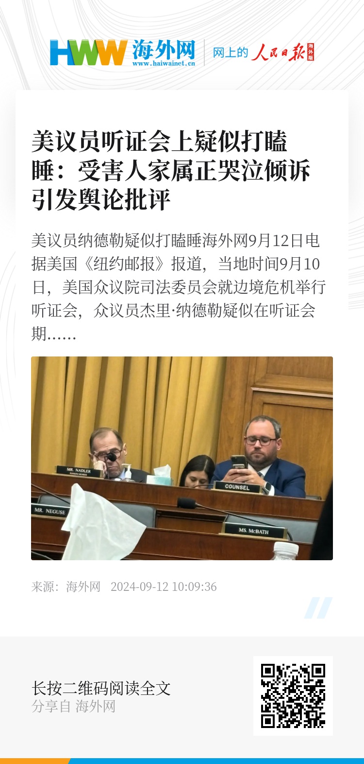 报道称,事发时,议员们正在听取遭受非法移民暴力侵害的人员家属发言。美国众议院司法委员会两名共和党人严厉批评纳德勒,称他没有认真对待证词。