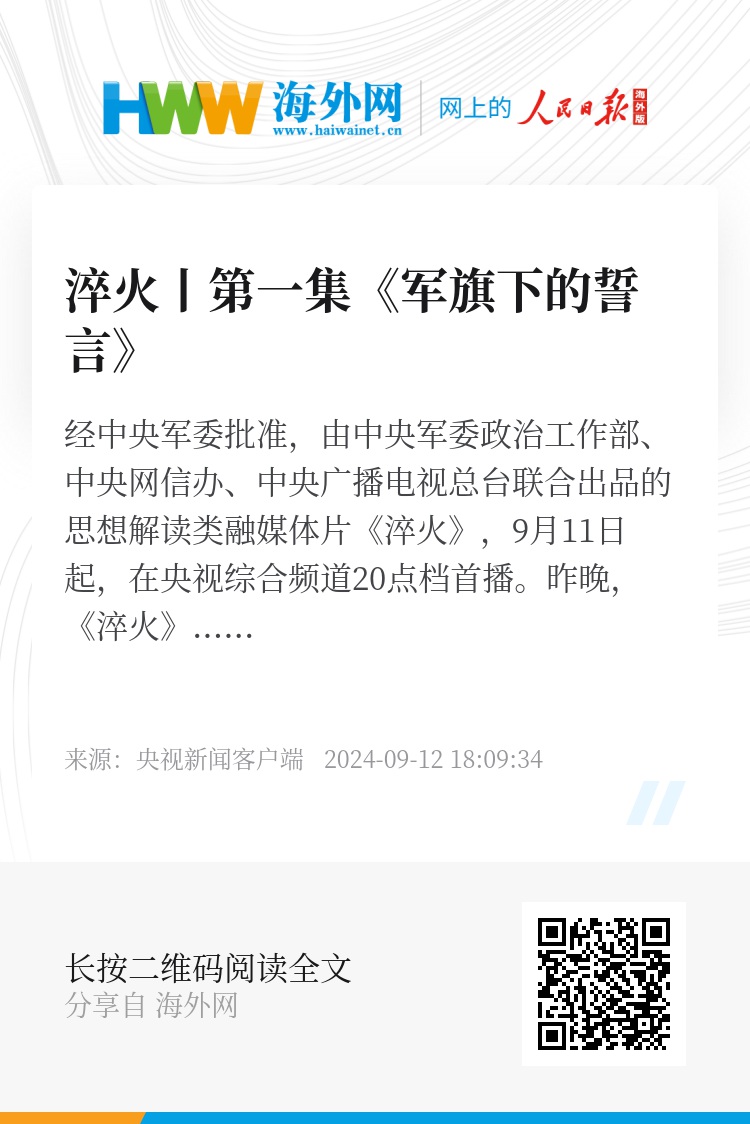 经中央军委批准,由中央军委政治工作部、中央网信办、中央广播电视总台联合出品的思想解读类融媒体片《淬火》,9月11日起,在央视综合频道20点档首播。昨晚,《淬火》播出第一集《军旗下的誓言》。