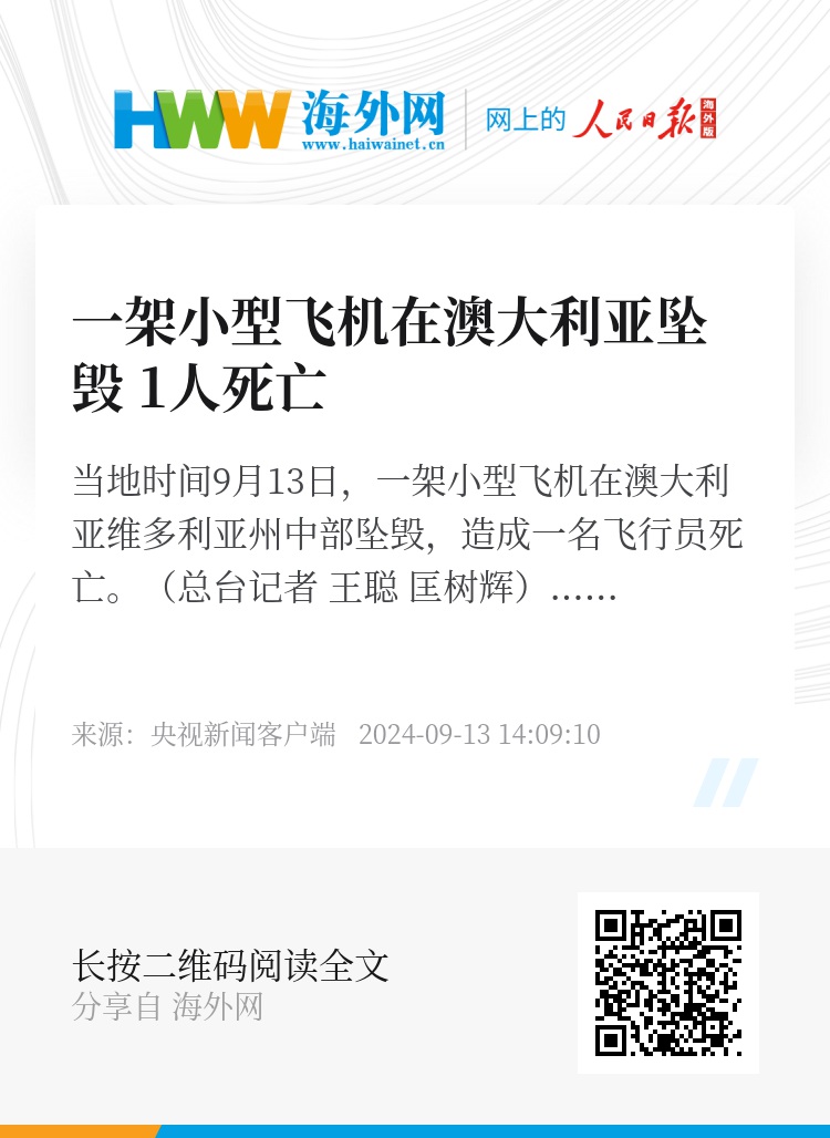 当地时间9月13日,一架小型飞机在澳大利亚维多利亚州中部坠毁,造成一名飞行员死亡。(总台记者 王聪 匡树辉)
