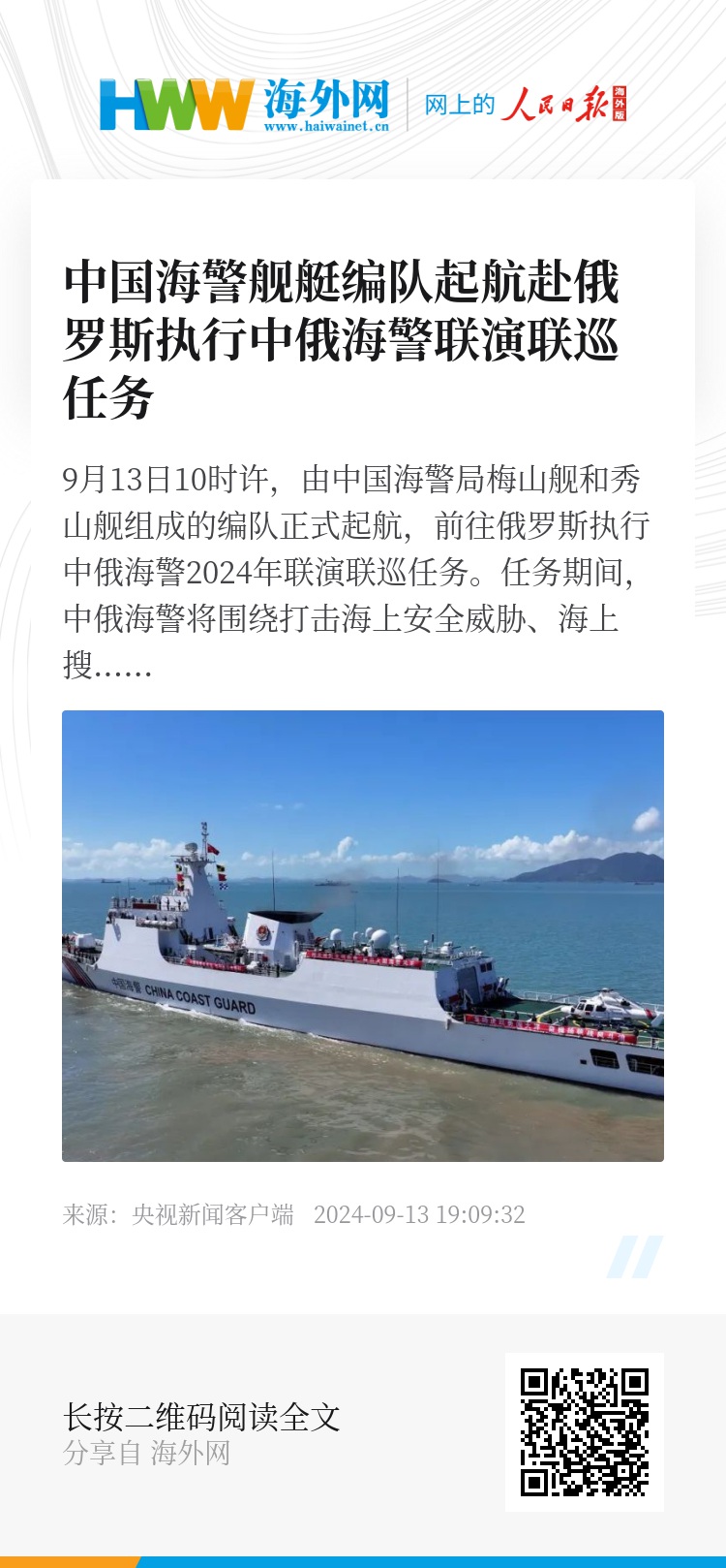 9月13日10时许,由中国海警局梅山舰和秀山舰组成的编队正式起航,前往俄罗斯执行中俄海警2024年联演联巡任务。