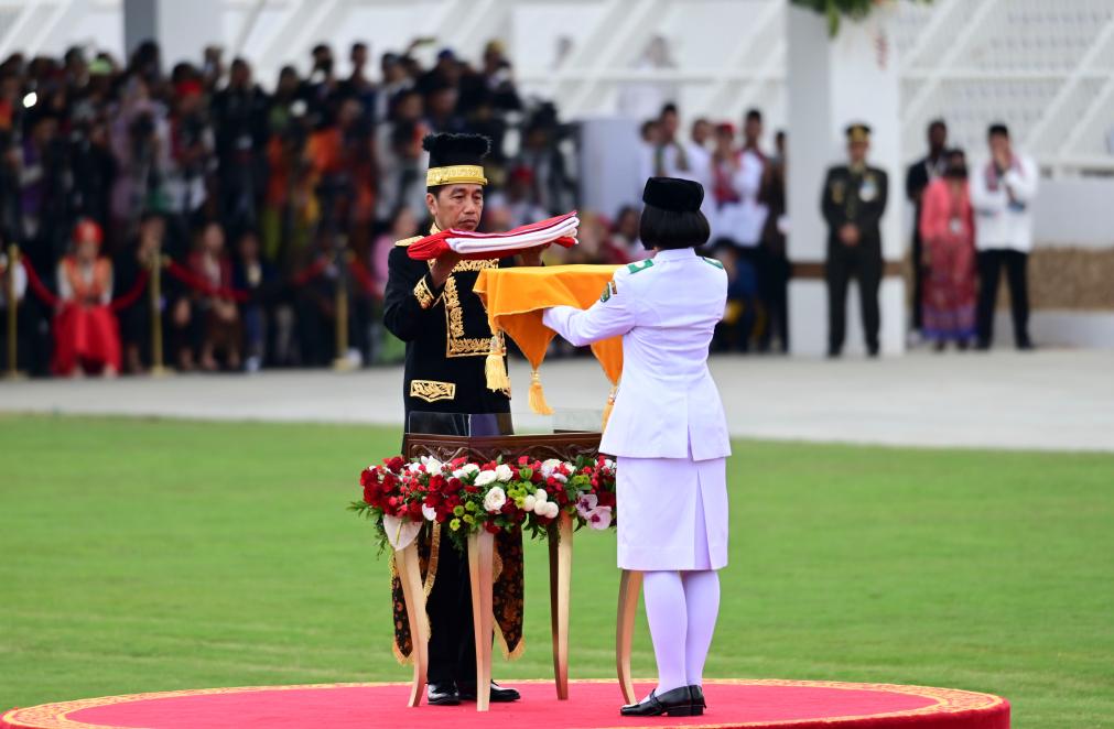 8月17日,在印度尼西亚努山塔拉,印尼总统佐科(左)参加独立日活动上的升旗仪式。新华社发(祖卡南摄)