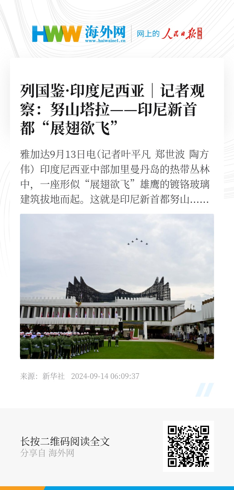 新华社雅加达9月13日电(记者叶平凡 郑世波 陶方伟)印度尼西亚中部加里曼丹岛的热带丛林中,一座形似“展翅欲飞”雄鹰的镀铬玻璃建筑拔地而起。这就是印尼新首都努山塔拉新建的总统府,造型呼应印尼国徽中的神鹰形象。