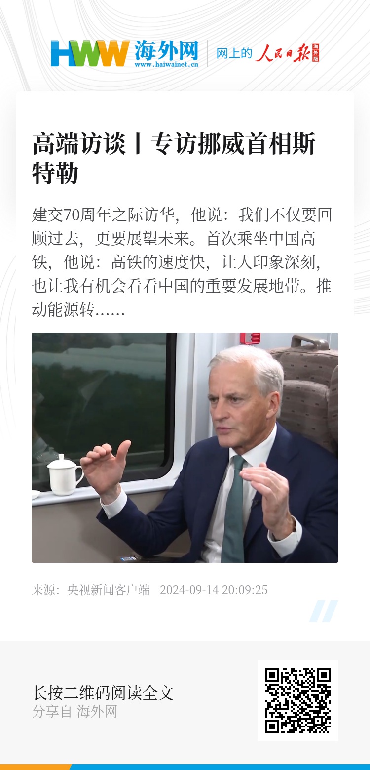 斯特勒:驻北京的挪威外交官和李强总理都告诉我,如果去上海的话,他们都推荐坐高铁。我本以为飞机更快,但现在看来高铁一样快。这很好地体现了中国的现代化。