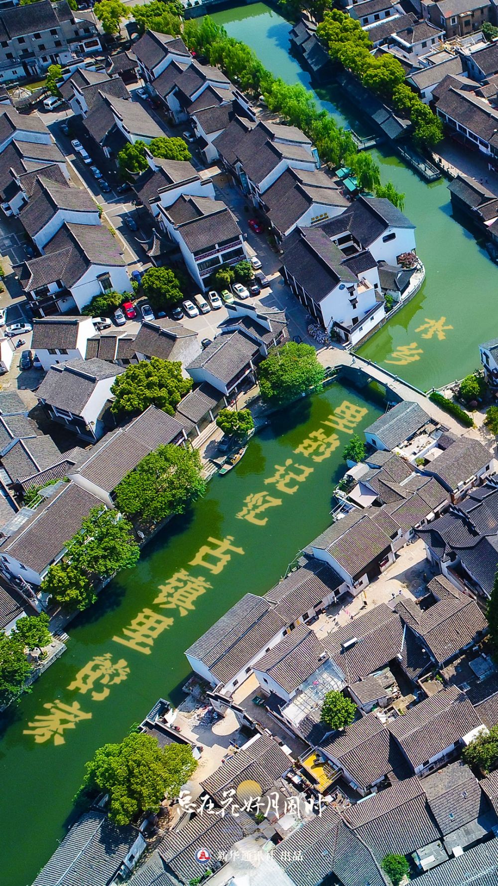 从空中俯瞰古镇,马头墙和屋脊层层叠叠、连绵不断,是一种古朴的江南式美学呈现。