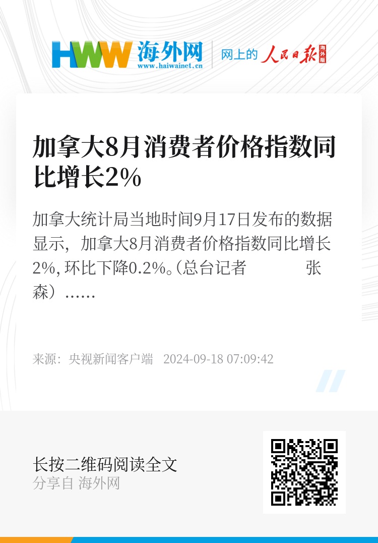 加拿大统计局当地时间9月17日发布的数据显示,加拿大8月消费者价格指数同比增长2%,环比下降0.2%。(总台记者 张森)