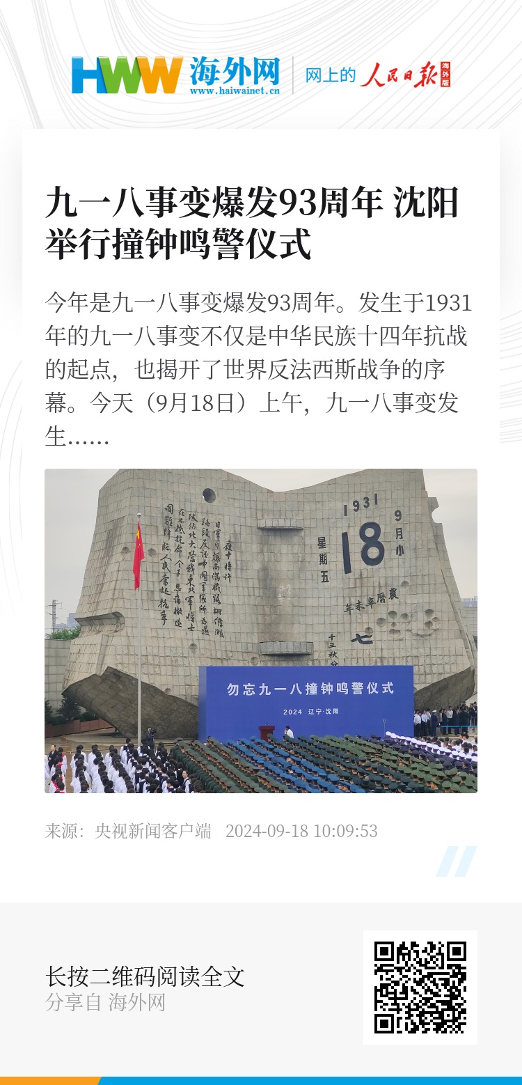 今年是九一八事变爆发93周年。发生于1931年的九一八事变不仅是中华民族十四年抗战的起点,也揭开了世界反法西斯战争的序幕。今天(9月18日)上午,九一八事变发生地辽宁沈阳,举行了勿忘九一八撞钟鸣警仪式。