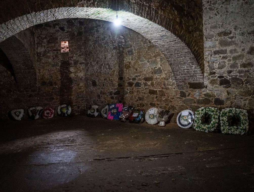 这是6月19日在加纳海岸角奴隶堡拍摄的地牢一隅,墙边摆满了人们寄托哀思的鲜花。新华社记者 李亚辉 摄