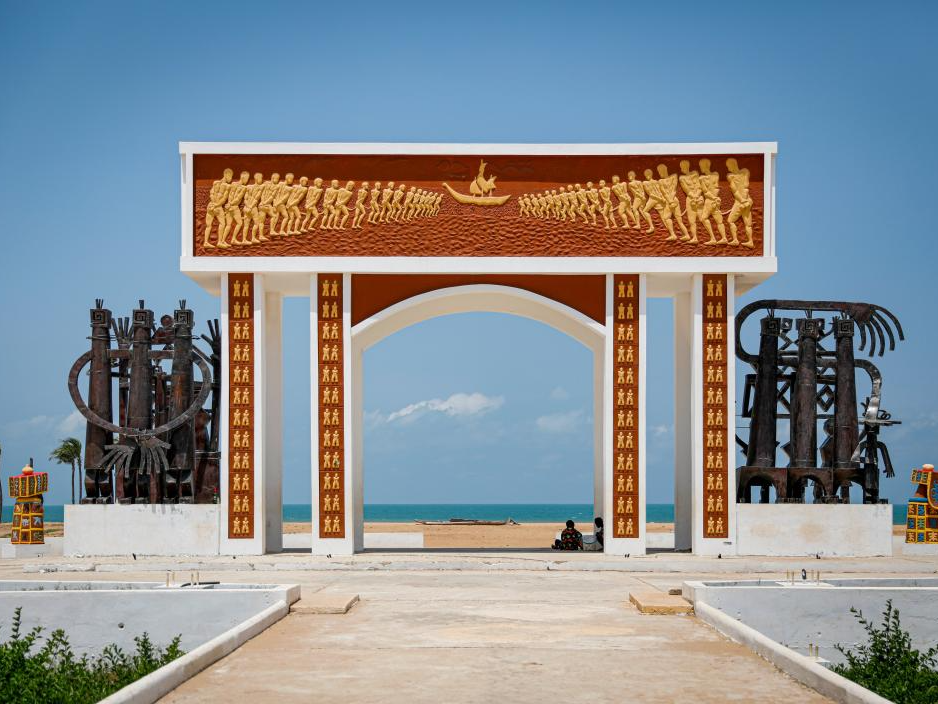 从加纳海岸角奴隶堡出发,沿海岸线向东行约450公里,贝宁维达古城的沙滩上矗立着又一座被称为“不归之门”的宏伟拱门,纪念从此地被贩卖至美洲的奴隶。