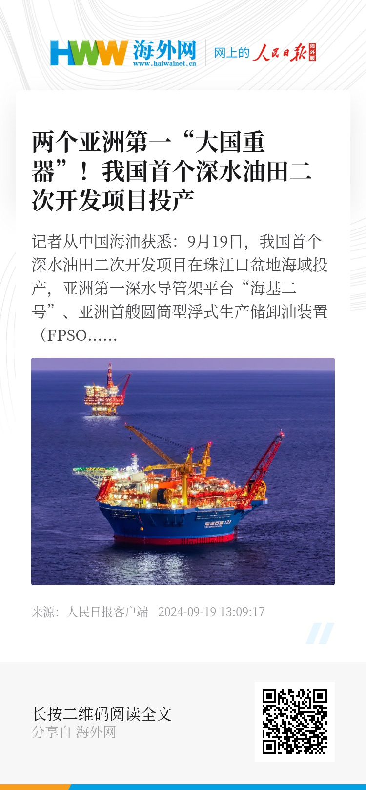 记者从中国海油获悉:9月19日,我国首个深水油田二次开发项目在珠江口盆地海域投产,亚洲第一深水导管架平台“海基二号”、亚洲首艘圆筒型浮式生产储卸油装置(FPSO)“海葵一号”携手“上岗”,标志着我国全类型深水油气装备的设计、建造和安装能力达到世界一流水平。