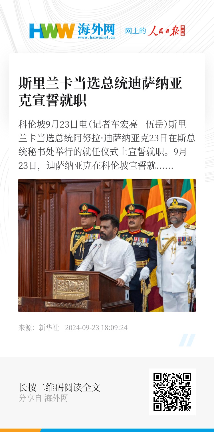 新华社科伦坡9月23日电(记者车宏亮 伍岳)斯里兰卡当选总统阿努拉·迪萨纳亚克23日在斯总统秘书处举行的就任仪式上宣誓就职。