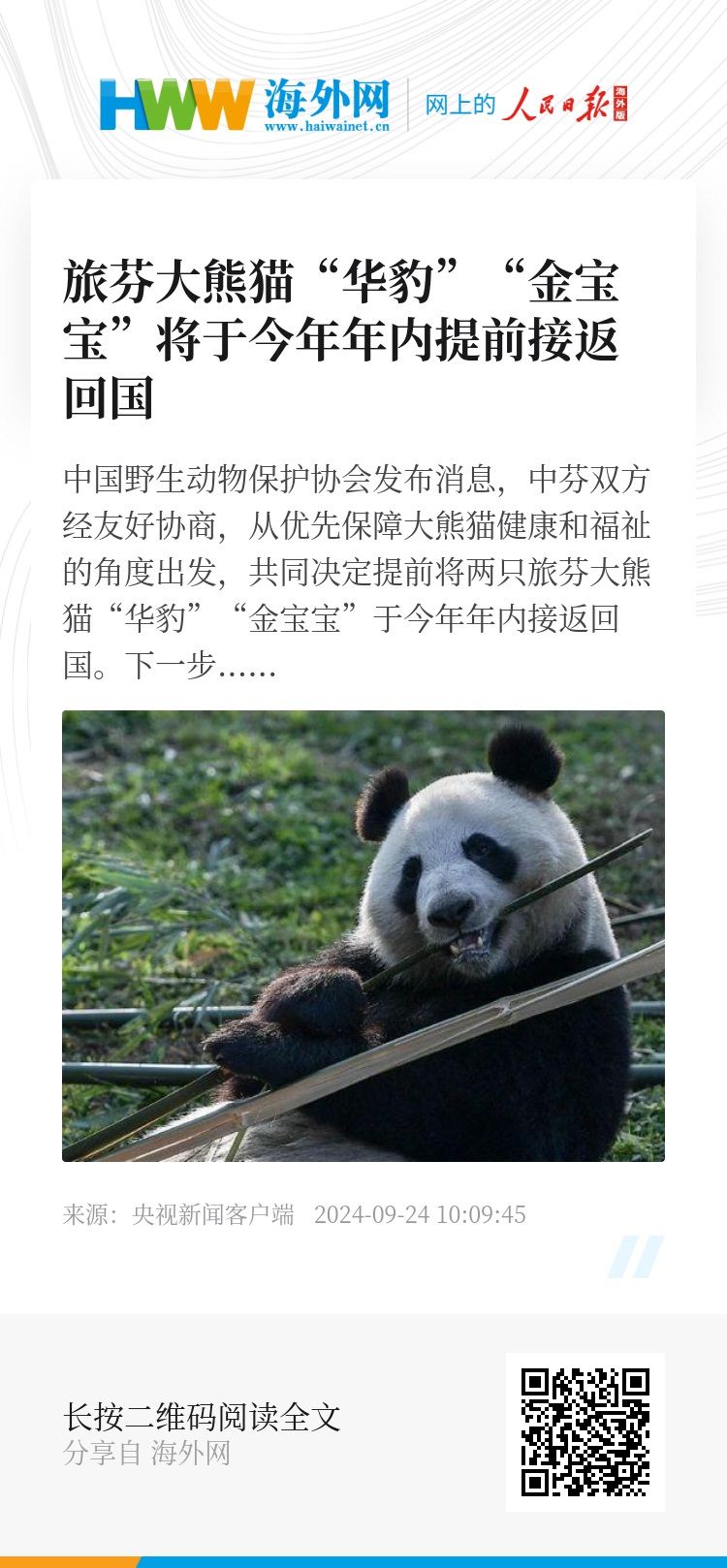 中国野生动物保护协会发布消息,中芬双方经友好协商,从优先保障大熊猫健康和福祉的角度出发,共同决定提前将两只旅芬大熊猫“华豹”“金宝宝”于今年年内接返回国。下一步,双方将保持沟通合作,共同做好大熊猫饲养管理和接返回国前的各项准备工作。