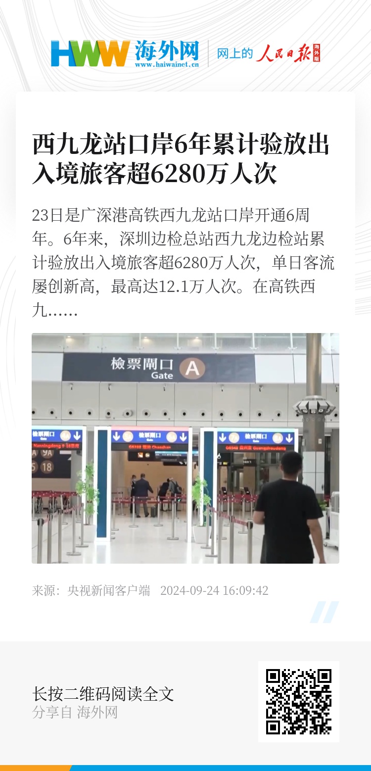 23日是广深港高铁西九龙站口岸开通6周年。6年来,深圳边检总站西九龙边检站累计验放出入境旅客超6280万人次,单日客流屡创新高,最高达12.1万人次。