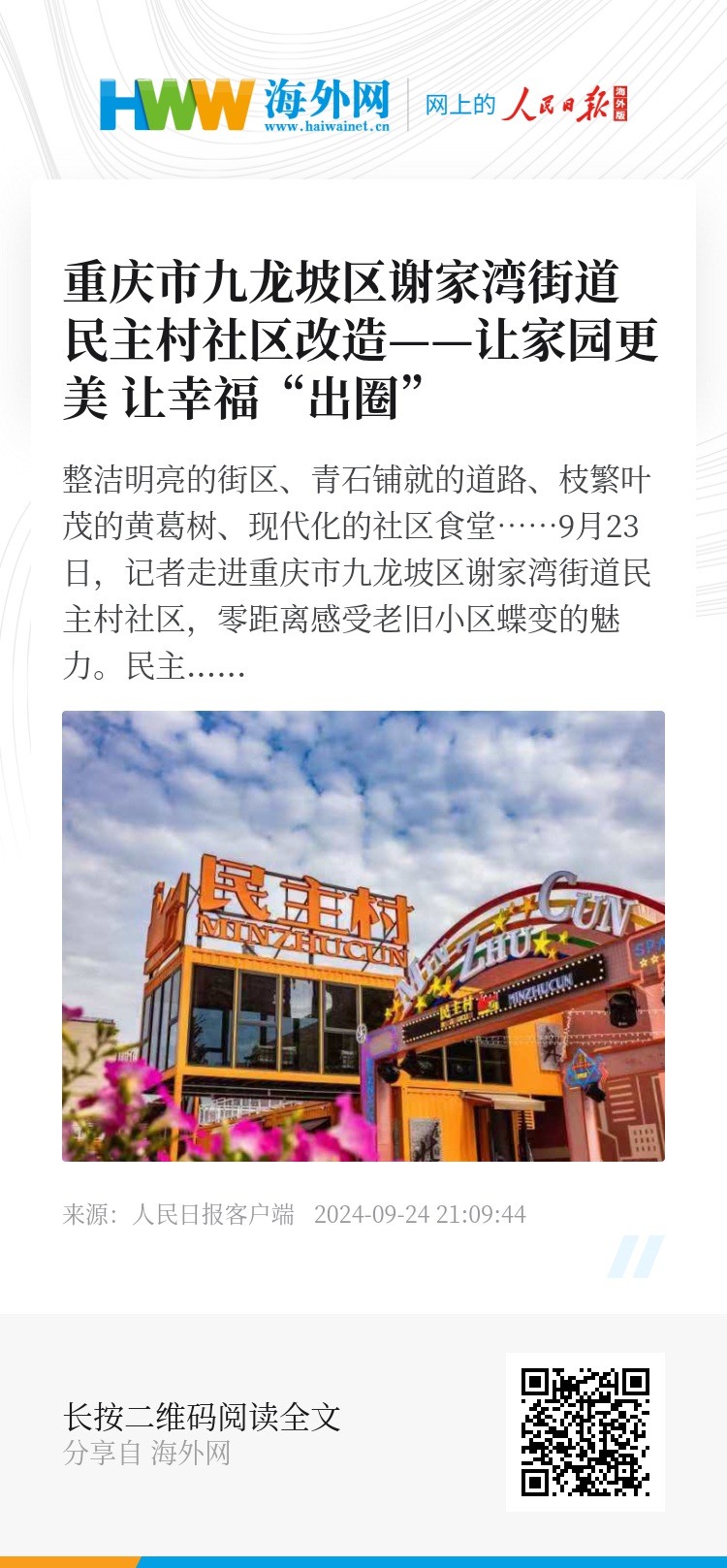 整洁明亮的街区、青石铺就的道路、枝繁叶茂的黄葛树、现代化的社区食堂……9月23日,记者走进重庆市九龙坡区谢家湾街道民主村社区,零距离感受老旧小区蝶变的魅力。
