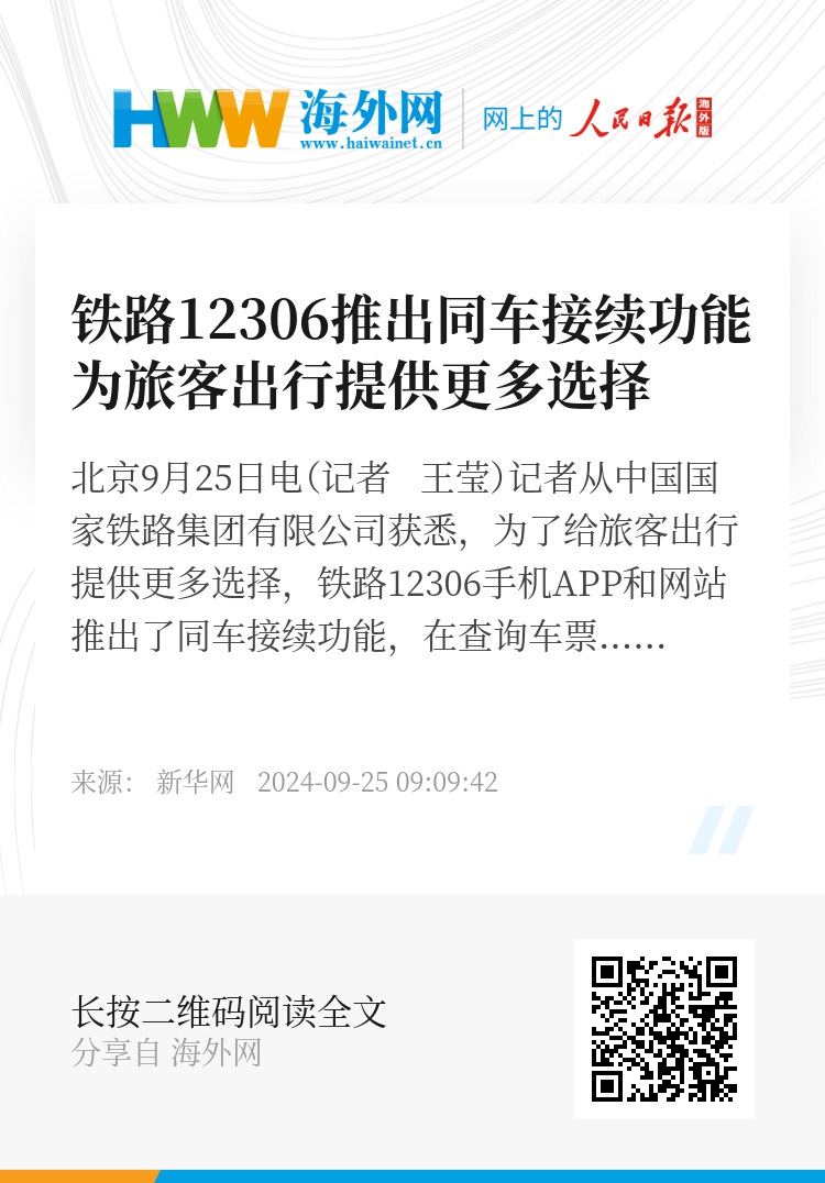 新华网北京9月25日电(记者 王莹)记者从中国国家铁路集团有限公司获悉,为了给旅客出行提供更多选择,铁路12306手机APP和网站推出了同车接续功能,在查询车票后,点击“中转”标签,系统在提供不同车次换乘方案的基础上,可将能组合的同一列车不同区段的两段同席别或不同席别的剩余车票,组合形成该车次的同车接续方案,供旅客选择。