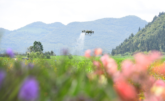 7月22日,云南省曲靖市罗平县罗雄街道外纳村的农民用无人机进行玉米飞防作业。新华社发(毛虹摄)