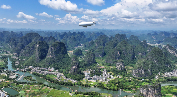 9月14日,“祥云”AS700载人飞艇在广西阳朔进行演示飞行(无人机照片)。新华社发(中国航空工业集团特种飞行器研究所供图)