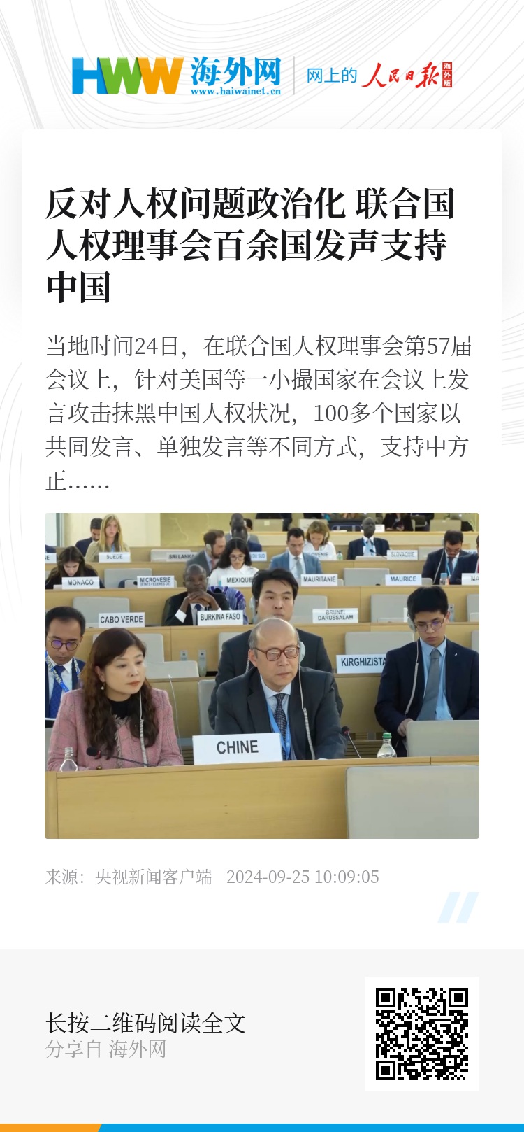 当地时间24日,在联合国人权理事会第57届会议上,针对美国等一小撮国家在会议上发言攻击抹黑中国人权状况,100多个国家以共同发言、单独发言等不同方式,支持中方正义立场,反对将人权问题政治化。