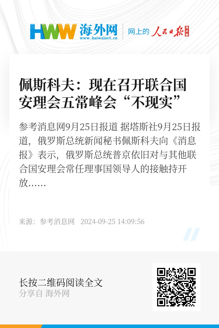 参考消息网9月25日报道 据塔斯社9月25日报道,俄罗斯总统新闻秘书佩斯科夫向《消息报》表示,俄罗斯总统普京依旧对与其他联合国安理会常任理事国领导人的接触持开放态度,但现在召开联合国安理会五常峰会不现实。