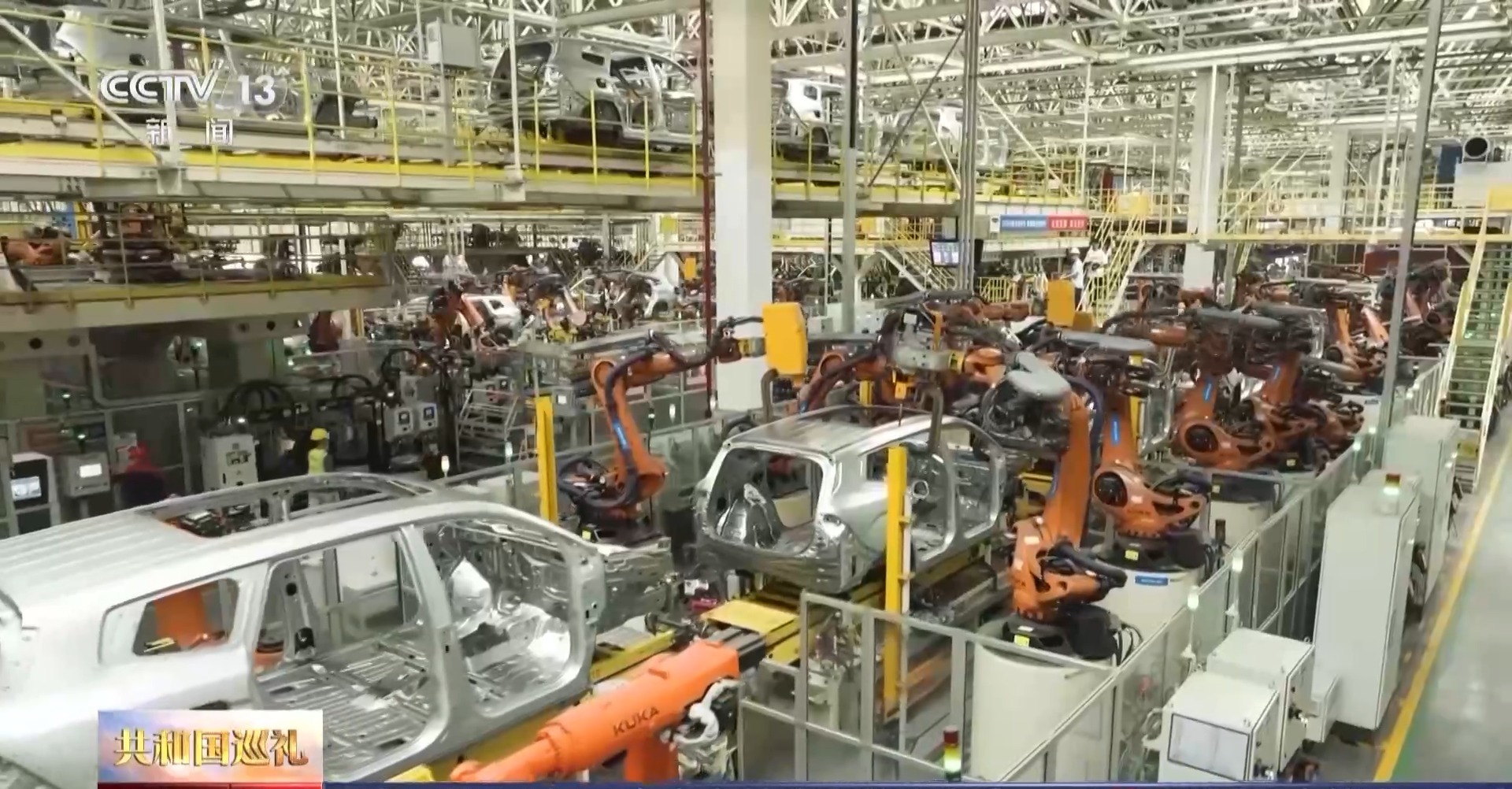 总台记者 田尹男:我们来到一款国产新能源汽车贵阳生产基地的总装车间,平均每天从这里交付的车辆达到500台左右,月产量目标是一万台以上。整个焊装车间一共有268台机器人进行作业,自动化率高达75%。在车间里的总拼工位,负责车身骨架的一体化焊接。光这一个工位就有10根机器人手臂同时焊接,只要61秒,一台完整车身就可以焊接完成。整个车间的设计产能是每小时45台,年产能可达30万台。