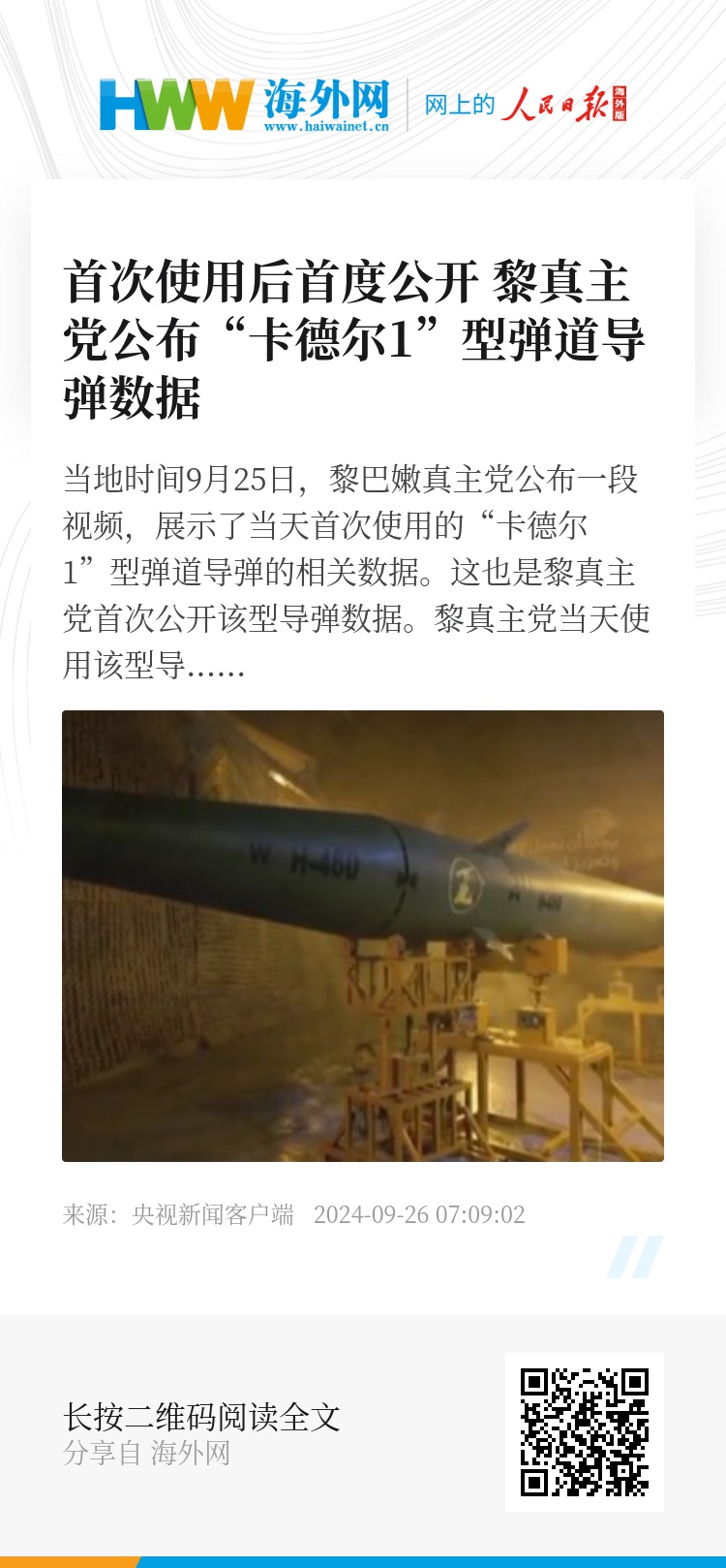 当地时间9月25日,黎巴嫩真主党公布一段视频,展示了当天首次使用的“卡德尔 1”型弹道导弹的相关数据。这也是黎真主党首次公开该型导弹数据。黎真主党当天使用该型导弹打击了位于以色列特拉维夫郊区的以色列情报和特勤局(摩萨德)总部。