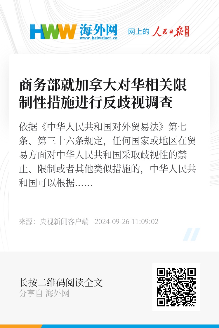 依据《中华人民共和国对外贸易法》第三十六条、第三十七条规定,商务部决定自2024年9月26日起对加拿大相关被调查措施启动反歧视调查。