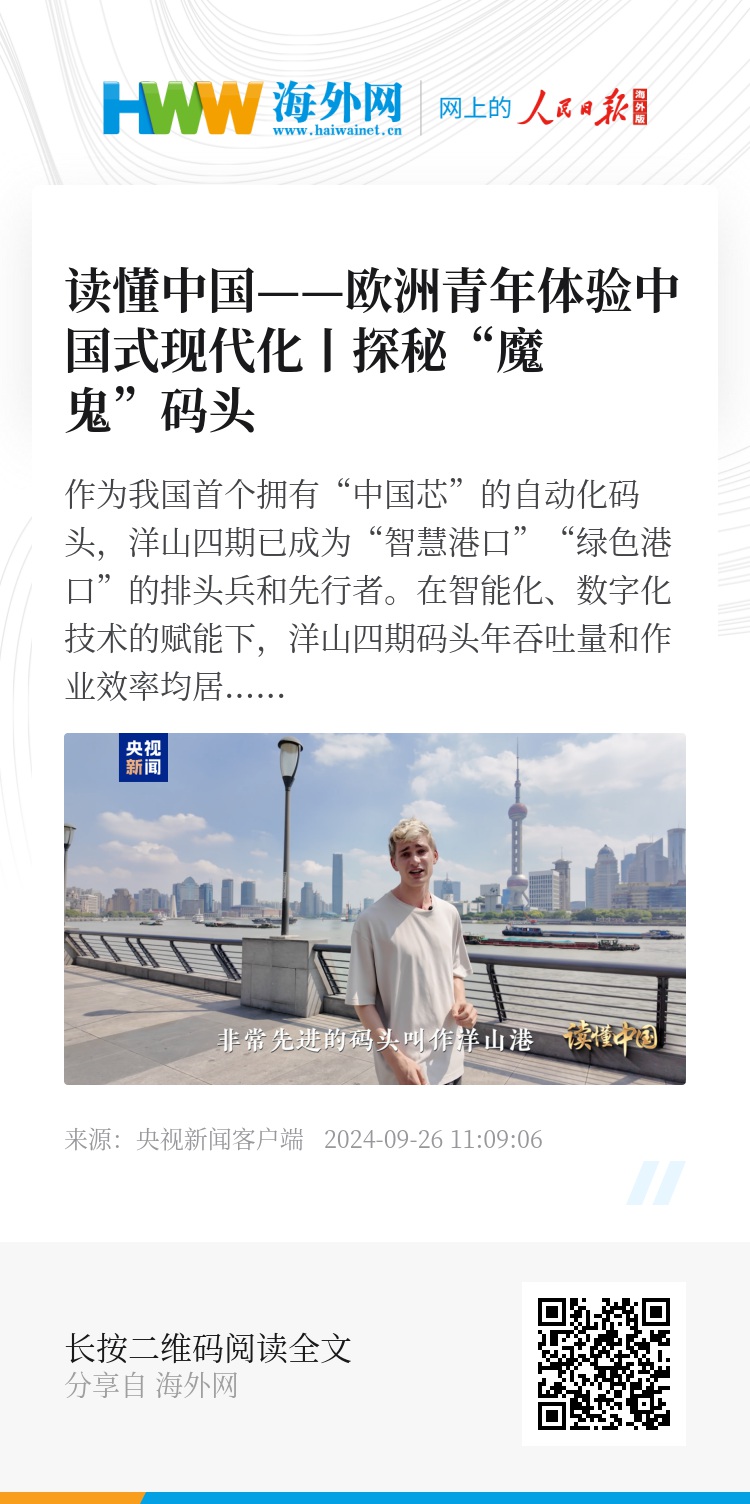 作为我国首个拥有“中国芯”的自动化码头,洋山四期已成为“智慧港口”“绿色港口”的排头兵和先行者。在智能化、数字化技术的赋能下,洋山四期码头年吞吐量和作业效率均居世界自动化码头首位。那里是如何实现全自动化运营的?一起跟随总台联合国中文日青年文化使者、比利时视频博主戴庐可去探秘一下这座“魔鬼”码头吧。