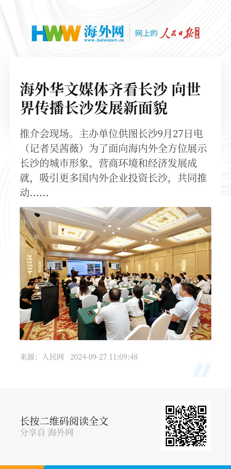 据悉,推介会后,海外华文媒体采访团一行将继续深入长沙的企业和园区进行实地采访,亲身体验长沙的营商环境和发展氛围,向世界传播、展示长沙经济发展的崭新面貌。