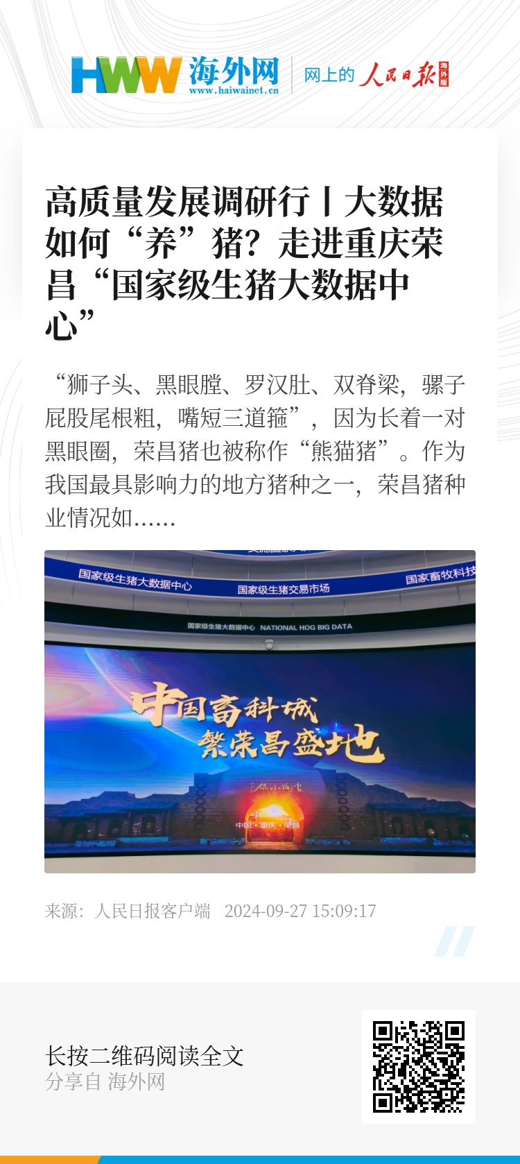 位于重庆市荣昌区的国家级生猪大数据中心,是农业农村部批准建设的全国首个、目前唯一的畜牧单品种国家级大数据服务平台,依托“数字监管平台”“智慧养殖管理系统”“生猪金融数据分析平台”三大平台,在有效解决生猪养殖产业“日常监管”“疫病防控”“金融贷款”三大难题的基础上,实现了生猪养殖、贩运、屠宰“一网式”实时监管。