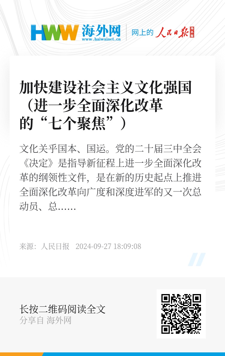 文化关乎国本、国运。党的二十届三中全会《决定》是指导新征程上进一步全面深化改革的纲领性文件,是在新的历史起点上推进全面深化改革向广度和深度进军的又一次总动员、总部署。《决定》紧紧围绕推进中国式现代化,在进一步全面深化改革的总目标中强调了“七个聚焦”,其中一个重要方面就是“聚焦建设社会主义文化强国”,展现了建设社会主义文化强国的美好前景。深入学习贯彻习近平文化思想,加快建设社会主义文化强国,深化文化体制机制改革,让人民群众物质生活和精神生活都富裕,让国家文化软实力和中华文化影响力不断提升,对于以中国式现代化全面推进强国建设、民族复兴伟业具有重要意义。