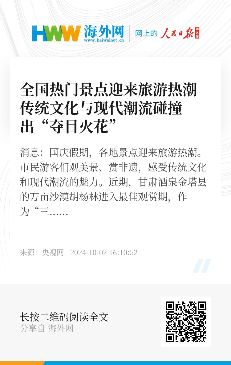央视网消息:国庆假期,各地景点迎来旅游热潮。市民游客们观美景、赏非遗,感受传统文化和现代潮流的魅力。