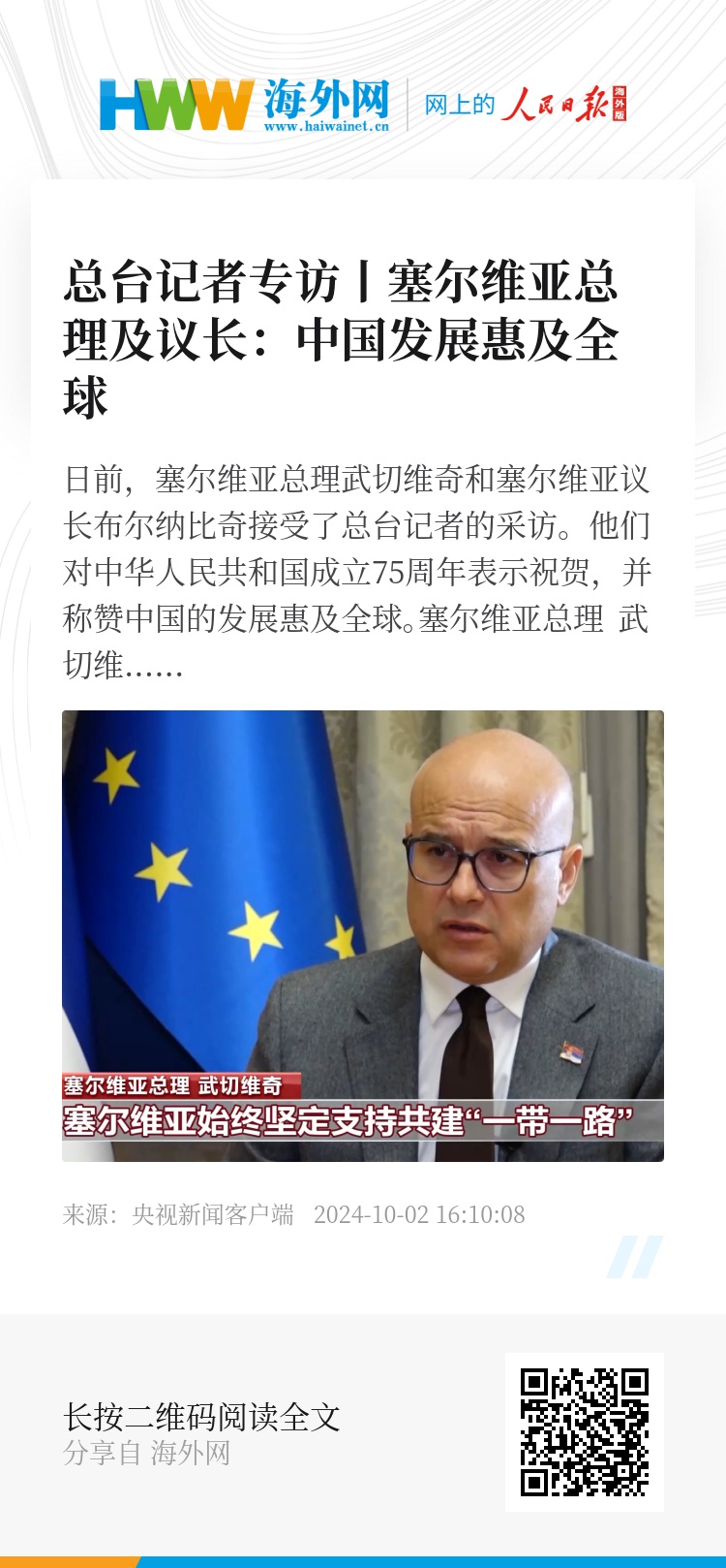 日前,塞尔维亚总理武切维奇和塞尔维亚议长布尔纳比奇接受了总台记者的采访。他们对中华人民共和国成立75周年表示祝贺,并称赞中国的发展惠及全球。